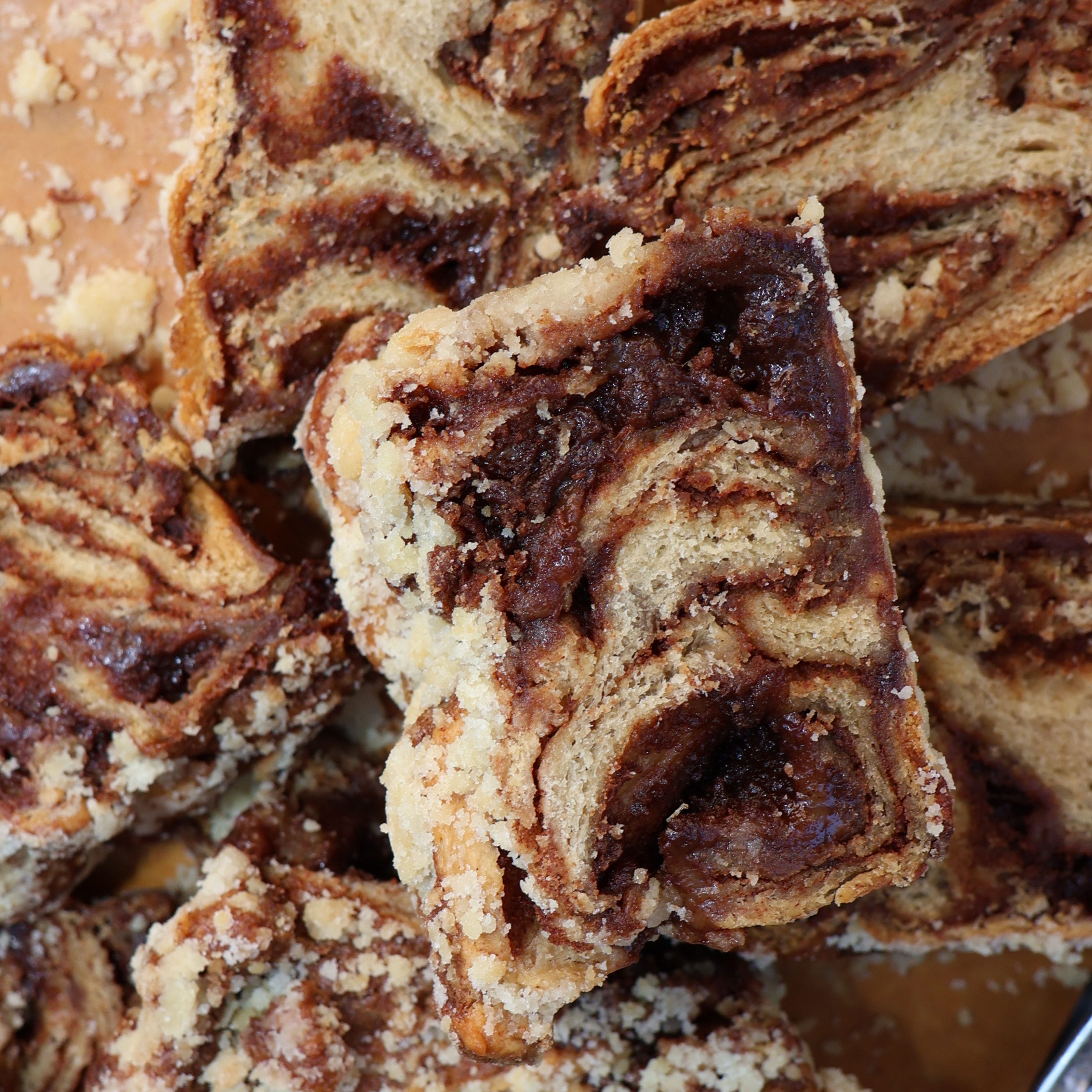 Cinnamon Babka: Enriched Wheat Flour (Unbleached Wheat Flour, Malted Barley Flour, Niacin, Reduced Iron, Thiamin Mononitrate, Riboflavin, Folic Acid), Sugar, Dark Brown Sugar, Canola Oil, Oat Milk (Water, Oats, Sunflower Oil, Dipotassium Phosphate, Calcium Carbonate, Tricalcium Phosphate, Sea Salt, Vitamin A Palmitate, Vitamin D2), Tofu (Water, Soybeans, Glucono Delta-Lactone, Calcium Chloride and/or Magnesium Chloride), Applesauce (Apples, Water, Ascorbic Acid), Cinnamon, Contains less than 2% of: Cocoa Butter, Salt, Yeast, Pure Vanilla Bean Paste (Vanilla Extract, Sugar, Vanilla Bean Seeds, Xanthan Gum), Pure Vanilla Extract, Sunflower Lecithin.