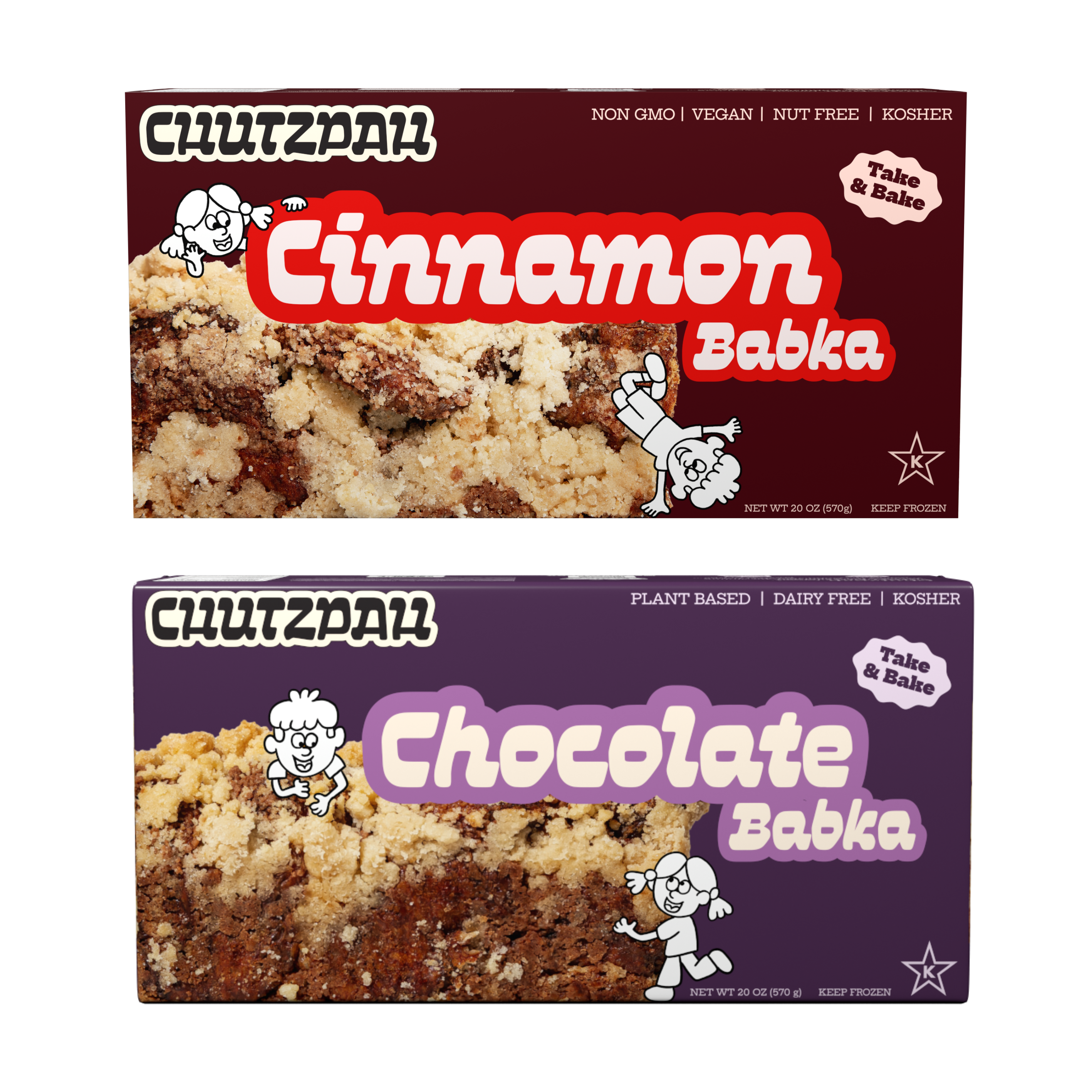 One Chocolate Babka. One Cinnamon Babka. Thick ribbons of gooey chocolate and swirls of warm cinnamon sugar, twisted into our soft, pillowy dough. 100% plant-based and outrageously delicious, Chutzpah will ruin all other babkas for you.